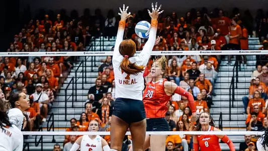 Skinner, Eggleston, and O’Neal served as the Texas Exes core of Austin’s five-set comeback, with Skinner earning player of the match honors on a whopping 24 kills on .327 hitting. Eggleston added 15 kills of her own from the left pin, as well as four aces from the service line. O’Neal’s five blocks and six kills brought flashbacks of her time in Burnt Orange and a gentle reminder as to why Texas has the nickname of “Middle Blocker U.”