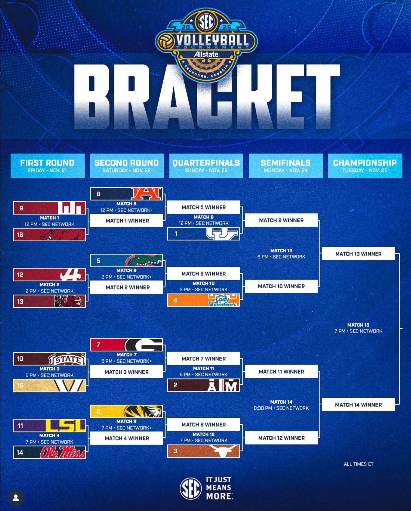 The top four seeds (#1 Kentucky, #2 Texas A&M, #3 Texas, and #4 Tennessee) all earned two byes to start the tournament. This means Texas will first take the court on Sunday, November 23rd against the winner of #6 Missouri vs. #14 Ole Miss / #11 LSU. The Longhorns were 9-1 in sets against these three teams this season (the lone dropped set was against Ole Miss), and should be able to cruise through this round before taking on either the Aggies or one of #15 Vanderbilt / #10 Mississippi State / #7 Georgia.