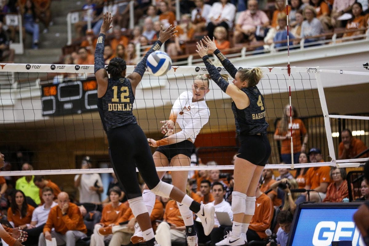 Texas did thrash Vanderbilt in their first set, winning by a margin of twelve points. The rest of the match would be much closer, winning by seven and four points for an average set margin across the match of 7 ⅔ points in Texas’ favor. The Longhorns did see their starting setter, Ella Swindle, miss the match due to an apparent injury, but the offense looked disjointed behind Rella Binney’s efforts in relief. Cari Spears especially suffered, hitting only .100 for the match with seven errors. The left side didn’t struggle at all, however, as Torrey Stafford hit over .600 while her contemporary on that pin, Abby Vander Wal, swung over .500 for a career-best showing offensively.