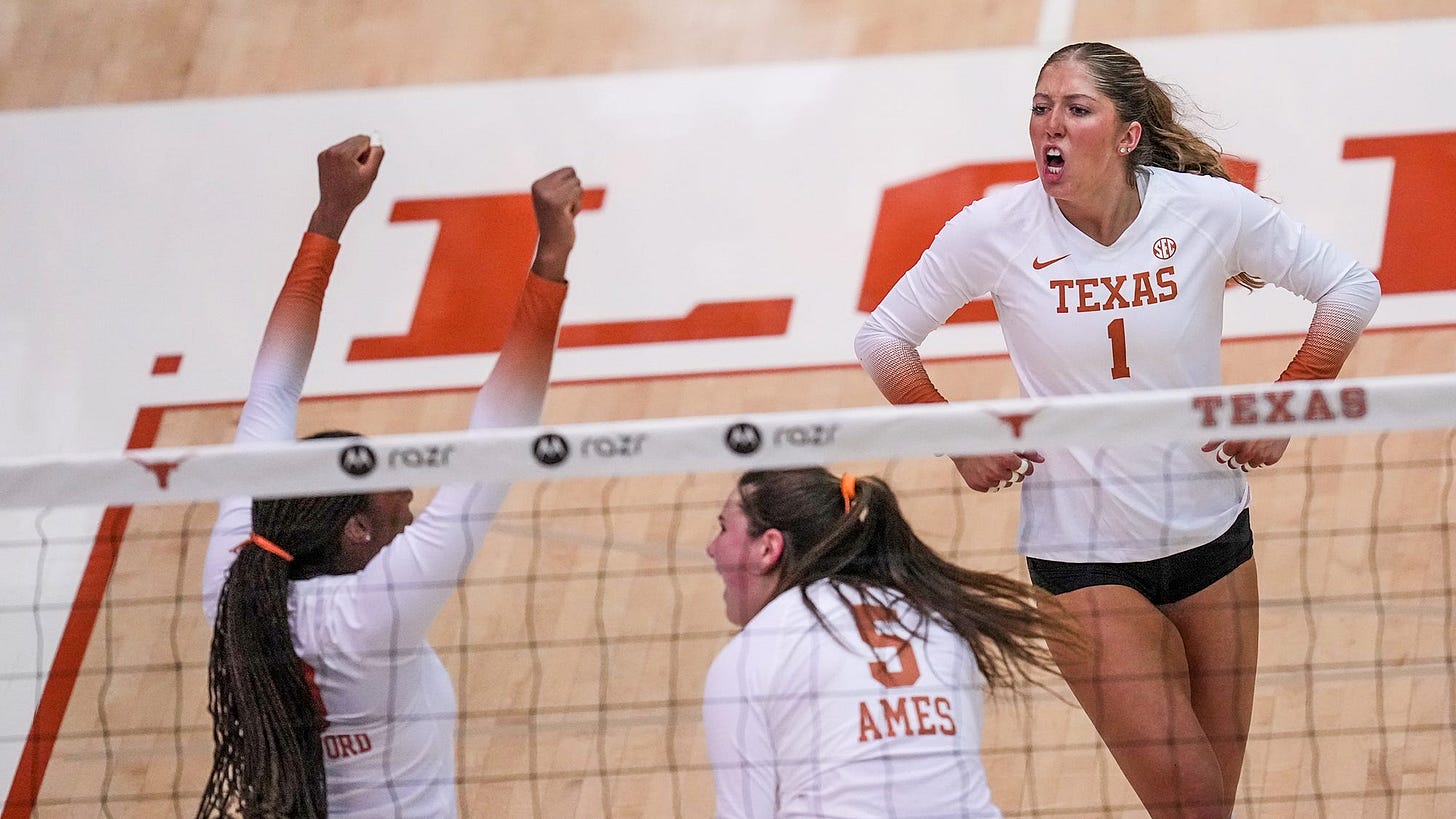 Texas missed Asjia O’Neal a ton in 2024. I don’t think too many people would argue that. Where I’m sure the real confusion lies is in why I’m invoking her name in a section that is titled “QB1”, indicating that I’m getting ready to talk about the options at setter. It’s because Texas missed more than Asjia’s technical ability or general experience - Texas desperately lacked her energy. While I wouldn’t describe the team as “quiet” last year, Asjia carried herself with a fiery intensity that I would argue was infectious with her teammates. The closest woman on the roster to that attitude last year was Ella Swindle, and the disastrous experiment with the 6-2 meant she spent most of the season on the bench. Not that you can’t be a vocal leader from the backup role, but it’s not the same as the in-your-face-screaming-hyping-you-up-because-that-kill-was-badass-holy-shit approach that you would’ve seen Ella bringing after every point were she on the floor. Sometimes there’s more to the game than technical prowess, and encouraging the setter (often referred to as the quarterback of the offense in volleyball) to be that fiery, vocal leader could pay dividends in the rest of the team outside of simply keeping the offense in rhythm.